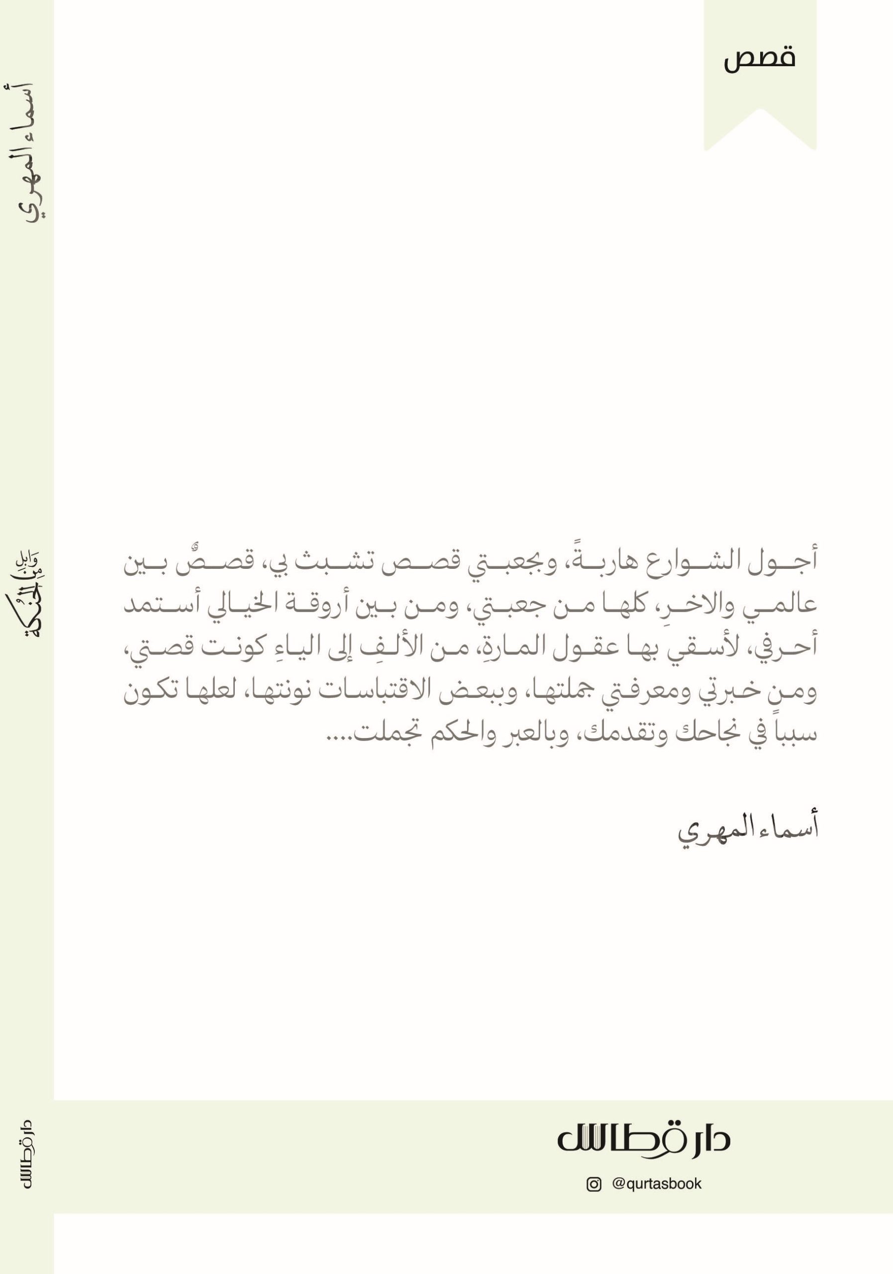 أجول الشوارع هاربة، وبجعبتي قصص تشبث بي، قصص بين عالمي والاخر، كلها من جعبتي، ومن بين أروقة الخيالي أستمد أحرفي، لأسقي بها عقول المارة، من الألف إلى الياء كونت قصتي ومن خبرتي ومعرفتي جملتها، وببعض الاقتباسات نونتها، لعلها تكون سببا في نجاحك وتقدمك، وبالعبر والحكم تجملت…..