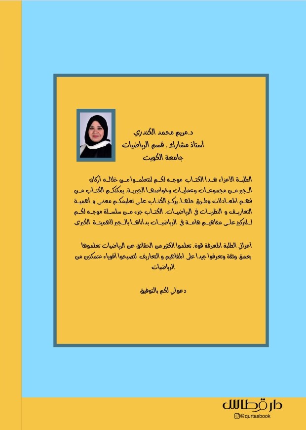 الطلبة الأعزاء هذا الكتاب موجه لكم لتتعلموا من خلاله أركان الجبر من مجموعات وعمليات وخواصها الجبرية. يمكنكم الكتاب من فهم المعادلات وطرق حلها. يركز الكتاب على تعليمكم معنى و أهمية التعاريف والنظريات في الرياضيات الكتاب جزء من سلسلة موجه لكم للتركيز على مفاهيم هامة في الرياضيات بدأناها بالجبر لأهميتة الكبرى