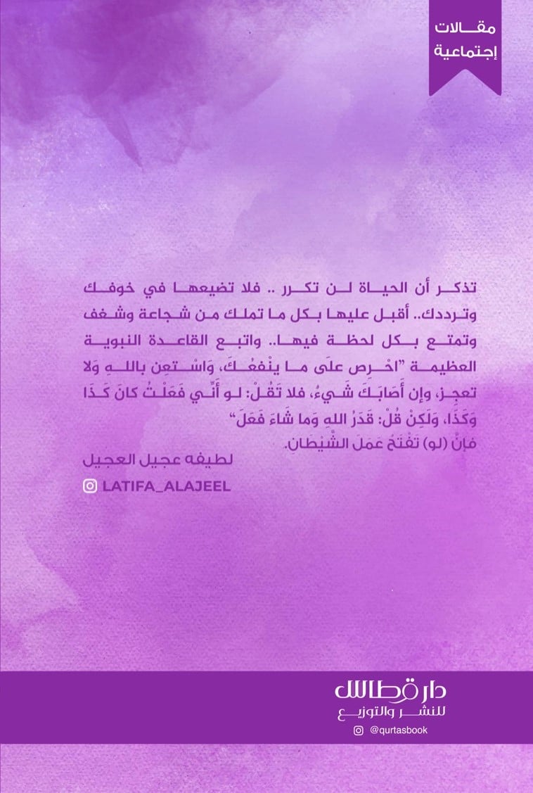 تذكر أن الحياة لن تكرر .. فلا تضيعها في خوفك وترددك.. أقبل عليها بكل ما تملك من شجاعة وشغف وتمتع بكل لحظة فيها.. واتبع القاعدة النبوية العظيمة اخرص على ما ينفعُكَ وَاسْتعن باللهِ وَلا تعجز، وإن أصَابَكَ شَيء، فلا تَقُل: لو أَنِّي فَعَلْتُ كَانَ كَذَا وَكَذَا، وَلَكِنْ قُلْ قَدَرُ اللهِ وَمَا شَاءَ فَعَلَ فإن (لو) تَفْتَحُ عَمَلَ الشَّيْطَان.